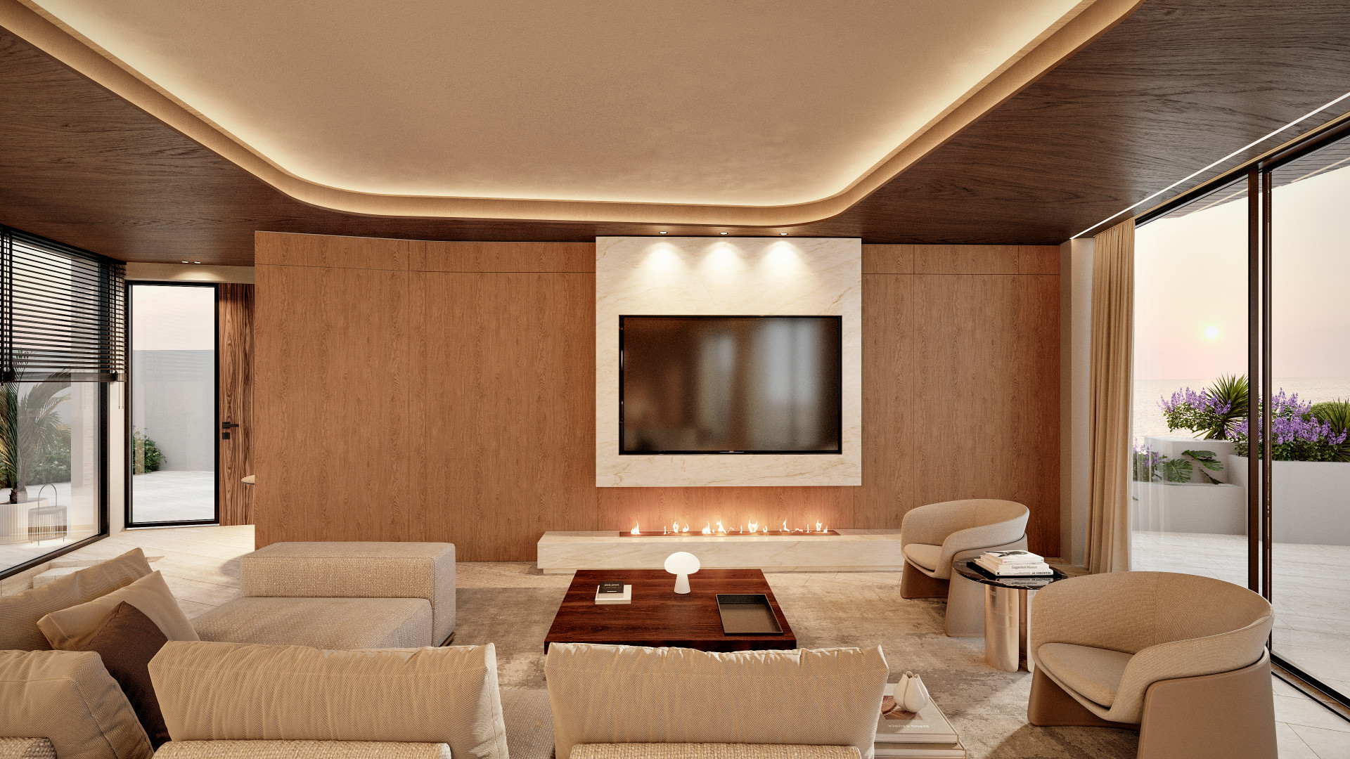 The house features four bedrooms with en-suite bathrooms, an additional staff room, seven bathrooms, a wine cellar, a spa, a gym, a cinema, and a spacious living room with an open-plan kitchen. Large sliding glass doors ensure a seamless transition between indoors and outdoors, with direct access to the panoramic terrace and infinity pool.